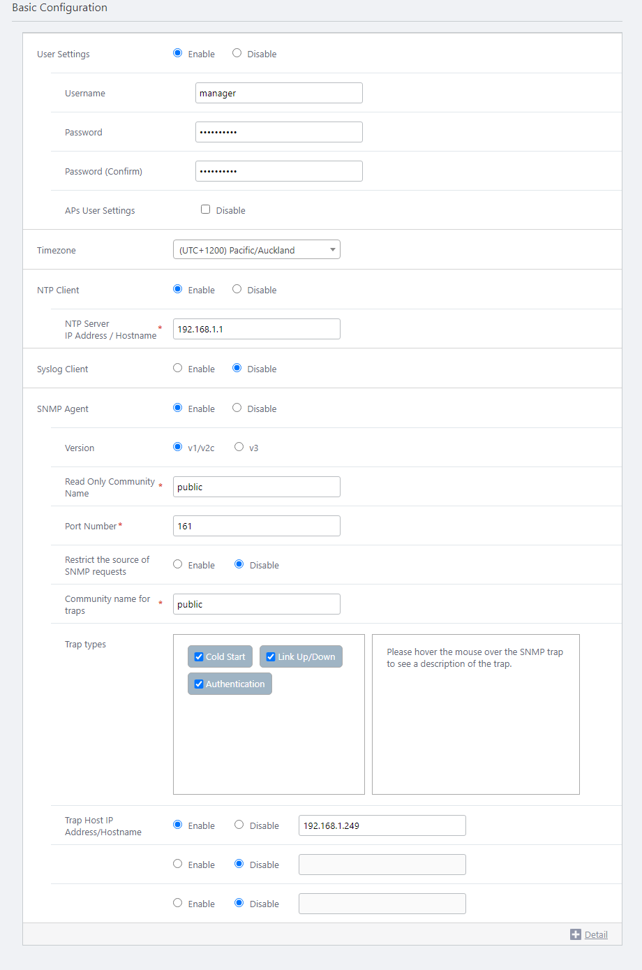 AuthenticationSelect the SNMP Trap types to generate. Trap Host IP Address/Hostname 192.168.1.249 Specify IP addresses or hostnames (FQDNs) to which SNMP traps will be sent.