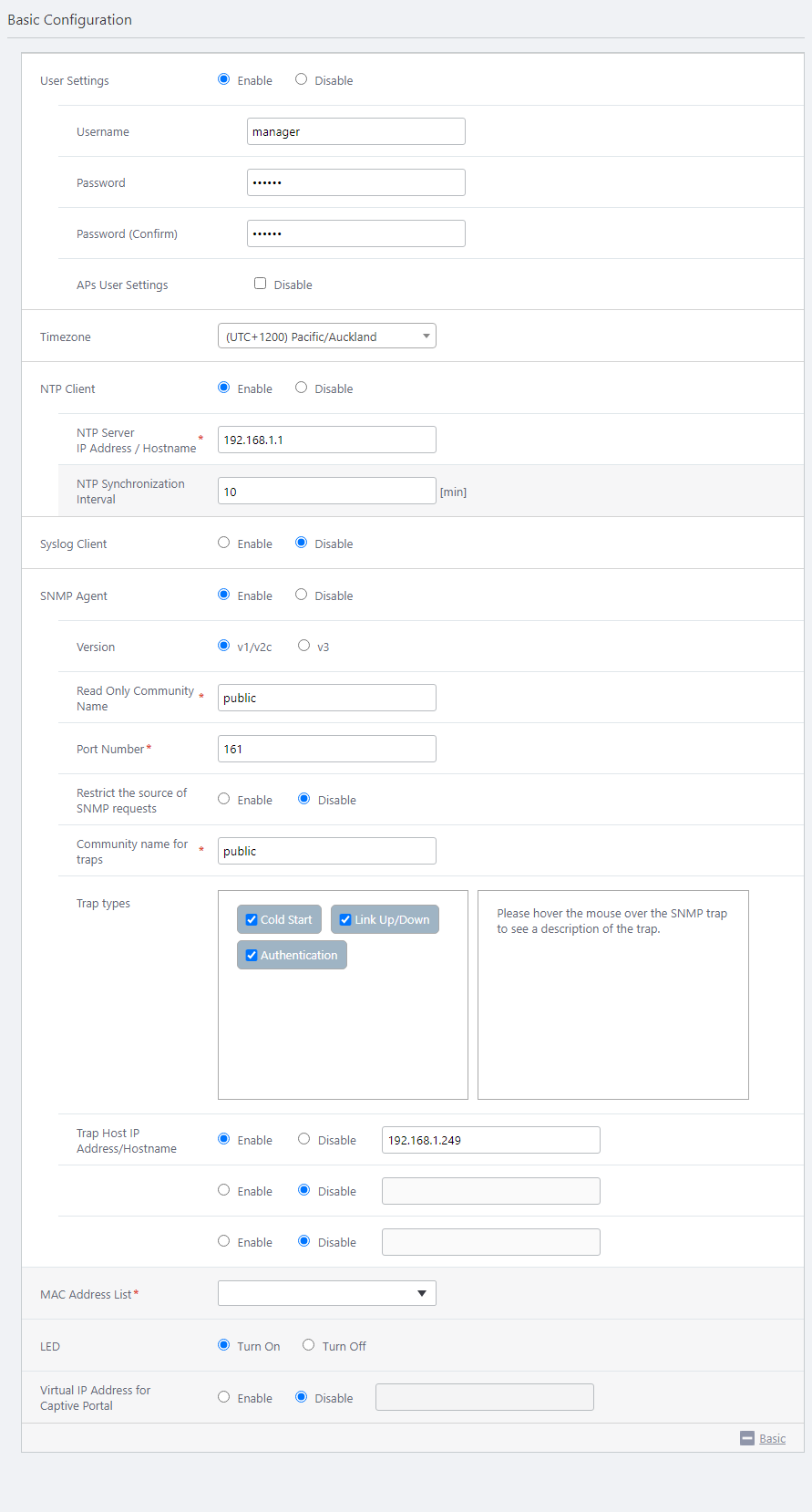 - You can specify the AP's system settings in the "Basic Configuration" section.