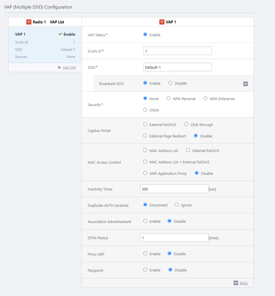 | L2 Traffic Inspection and Filtering | Specifies whether to discard L2 traffic (ARP, ICMP, TDKS) between VAPs. By selecting "Enable", these traffic will be discarded. The default is "Disable". |