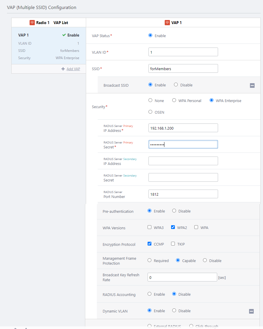 To use Dynamic VLAN with WPA Enterprise, please refer to Configure AP Profiles to configure WPA Enterprise and specify the RADIUS server. At this time, you also need to enable the "Dynamic VLAN" setting in the advanced settings section of WPA Enterprise.