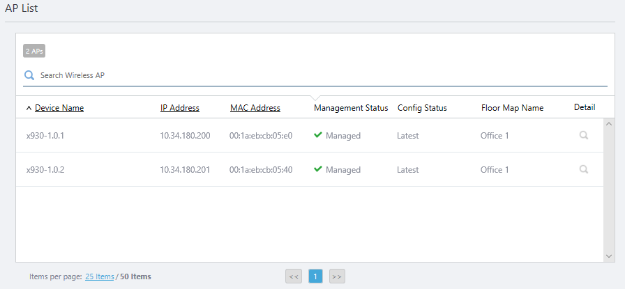 | Details (magnifying glass icon) | Shows the AP Details page. Refer to Operation Reference > Wireless Configuration > View AP Information for more details of the "AP Details" page. |