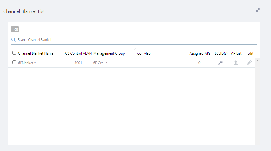Checkbox Lets you select channel blankets. A checkbox in the header row can be used to check or uncheck all channel blankets. Unchecking the box in the heading row deselects all entries in the list. Channel Blanket Name Shows the name of the channel blanket. CB Profile Name Shows the CB Profile name on which the channel blanket is based. Management Group Shows the list of Management Groups for the CB Profile. Assigned APs Shows the number of APs of which the CB Profile is assigned to. Unapplied APs Shows the number of APs for which pending configuration (AP Profile, CB Profile, SC Profile, or AP-specific configuration) exists. Detail (magnifying glass icon) Shows the "CB Profile Details" page. Refer to the Operation Reference > Channel Blanket > Create Channel Blanket" > "View Channel Blanket Information section for more details on the "CB Profile Details" page. - Select the CB Profiles to whose member APs you want to apply the pending configuration.