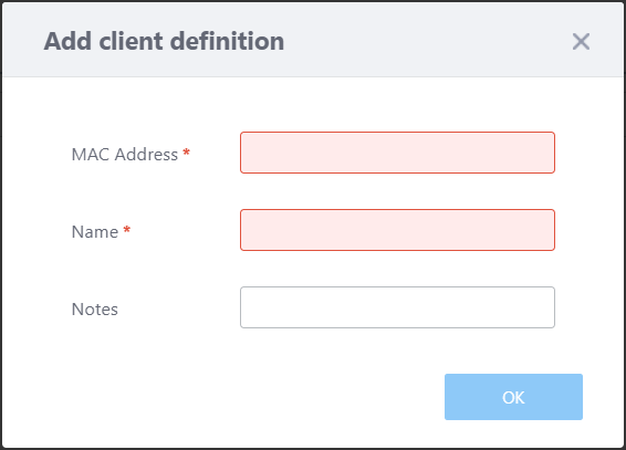 | Search client definition | Lets you search client definition entries. The Search field lets you enter a partial string to match. The screen displays entries with that string in one of the following fields: "MAC Address", "Name" or "Notes". To remove the filter, delete the string from the search field and press enter. NoteThe search is case-sensitive. |