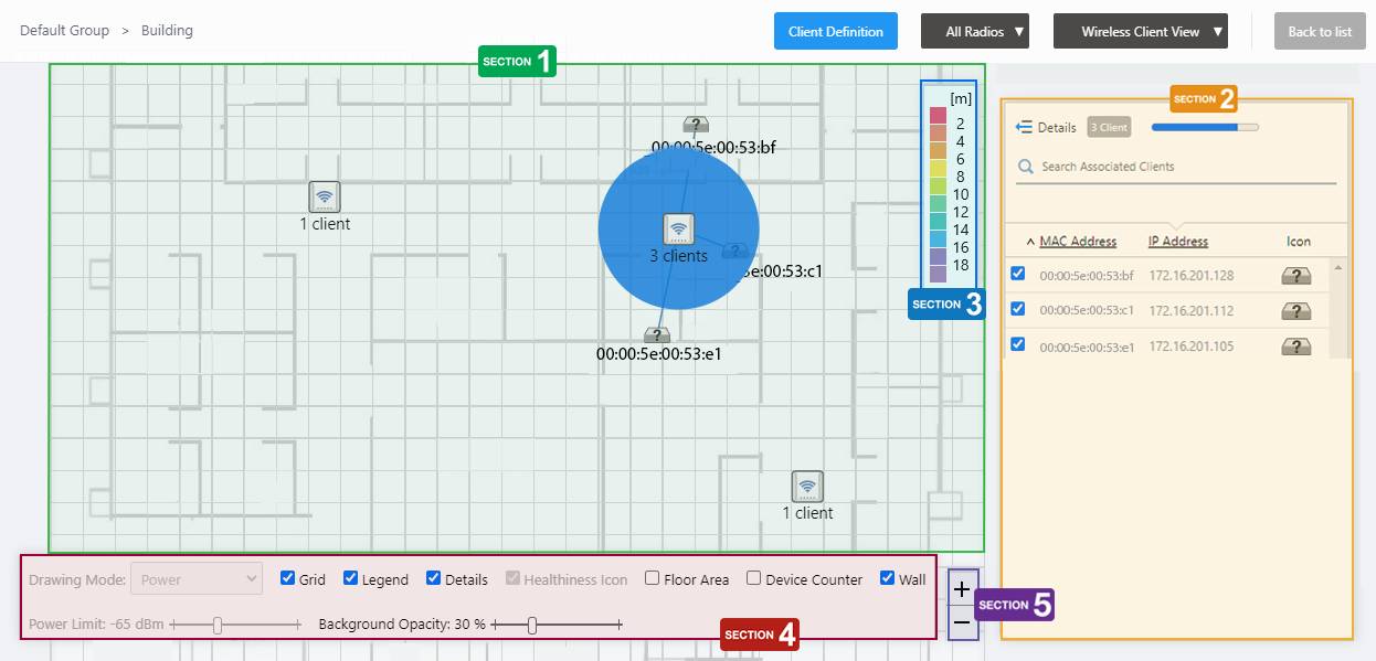 If you select "Wireless Client View" from the dropdown menu on Floor Map Details, the screen switches to the Wireless Client View screen.