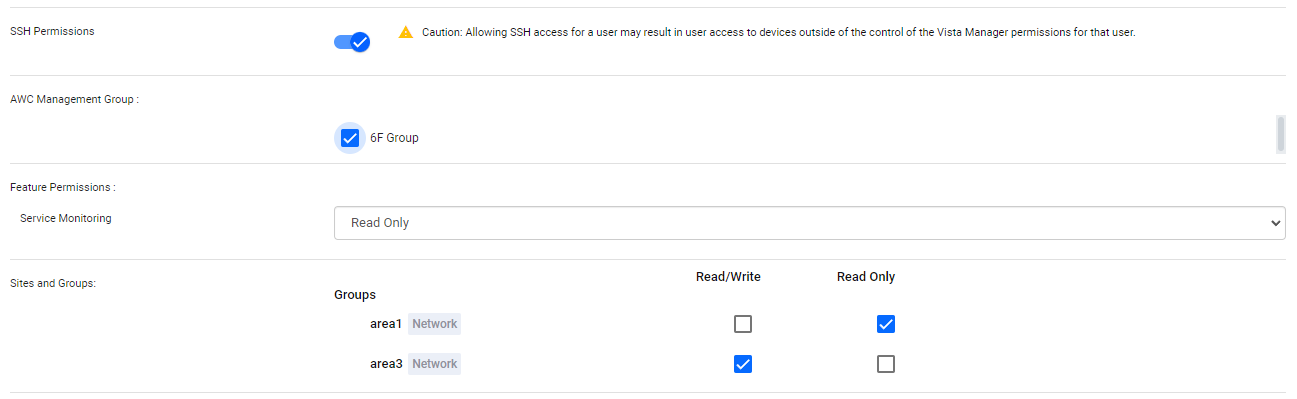 Permission controls on Vista Manager EX do not apply to operations on the SSH. In other words, if the SSH Permission is On, the user of the account can still make separate configuration changes in the CLI via the SSH connection to all AMF devices on the AMF network.