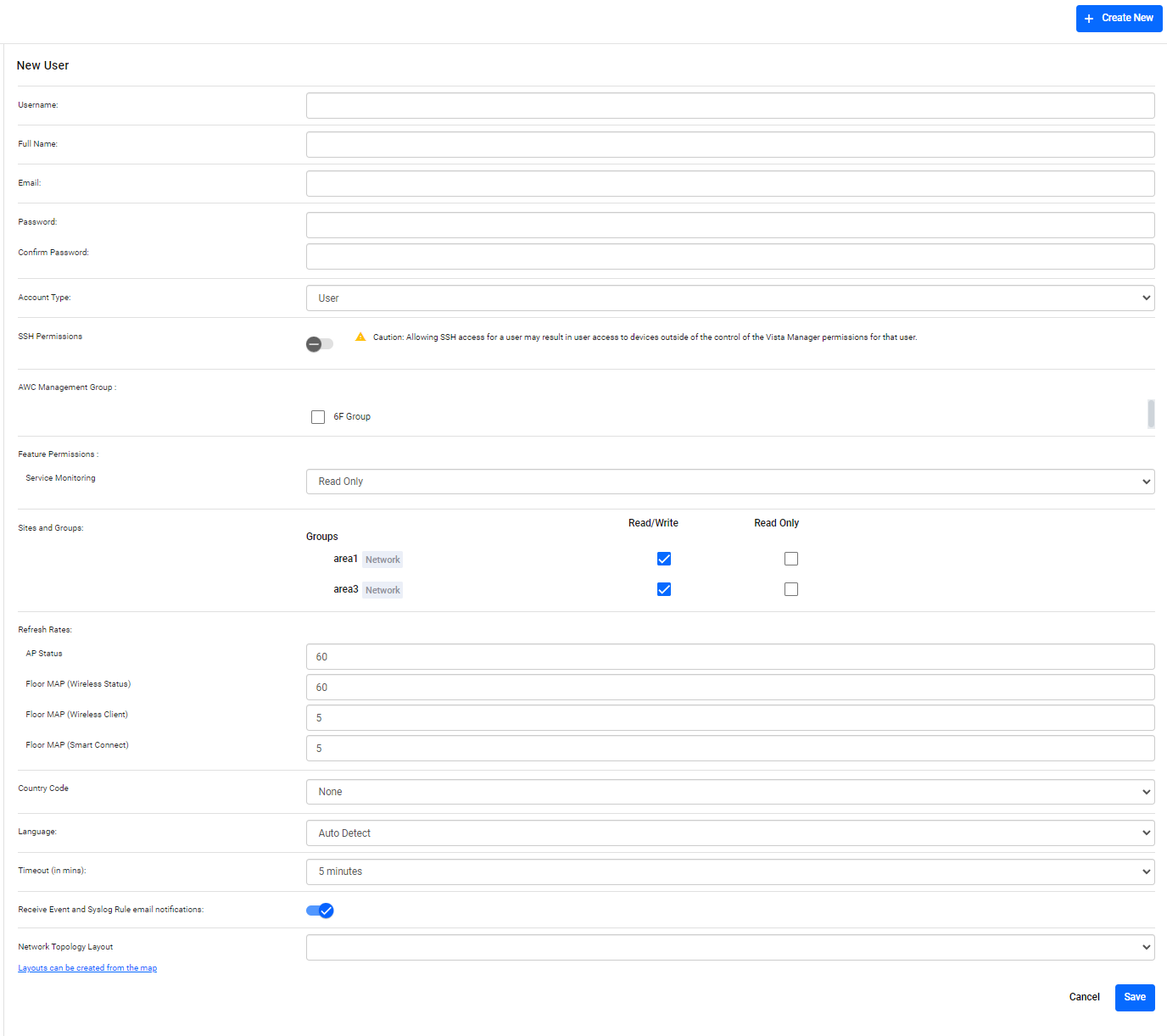 Table 4: Account Configuration 4 Item Name Value Description SSH Permissions Off If the Account Type is "User", the option for the permission of SSH connection to the AMF devices is displayed. The default is "Off".