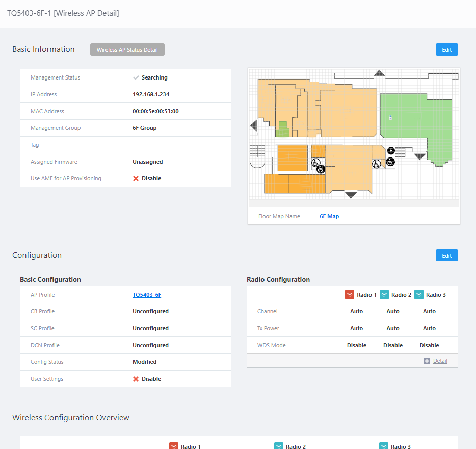 | Wireless Configuration | Shows the configuration for each radio band. The displayed radio bands vary depending on the Profile Type of the AP profile.