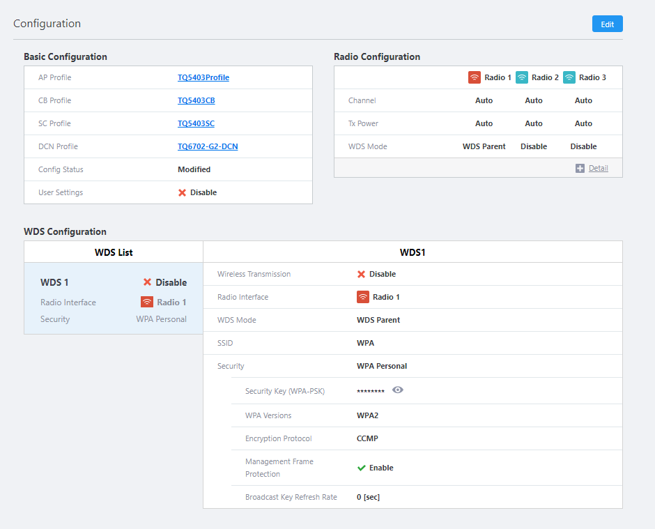 | WDS Mode | Shows the WDS configuration as either "Disable", "WDS Parent" (WDS Root AP) or "WDS Child" (WDS Satellite AP).NoteThis is only available for TQ1402, TQm1402, TQ5403, TQ5403e, TQm5403, TQ6602, TQ6602 GEN2, TQm6602 GEN2, TQ6702 GEN2, and TQm6702 GEN2. |