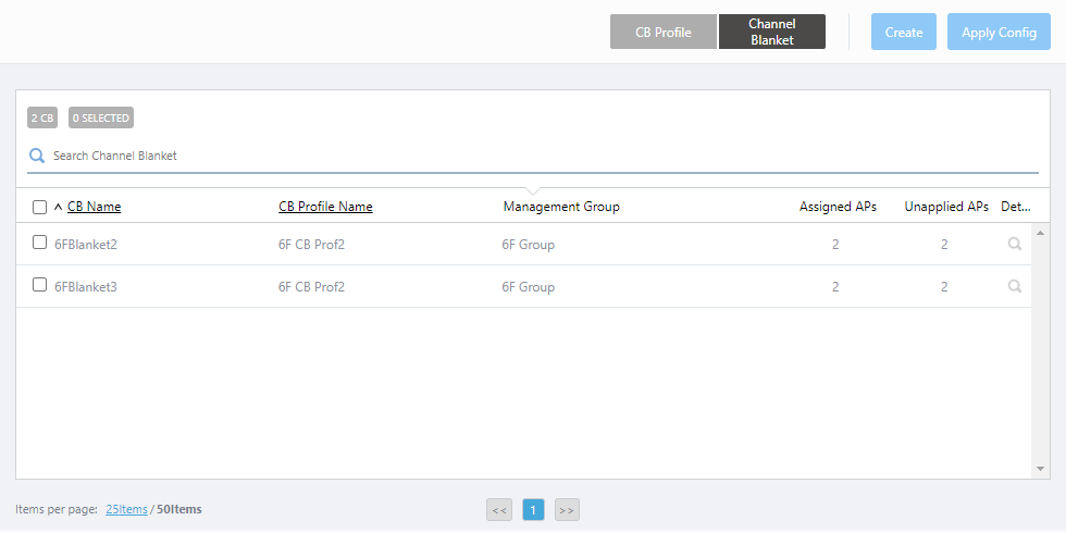 Checkbox Lets you select channel blankets. A checkbox in the header row can be used to check or uncheck all channel blankets. Unchecking the box in the heading row deselects all entries in the list. CB Name Shows the name of the channel blanket. CB Profile Name Shows the CB Profile name on which the channel blanket is based. Management Group Shows the list of Management Groups for the CB Profile. Assigned APs Shows the number of APs of which the CB Profile is assigned to. Unapplied APs Shows the number of APs for which pending configuration (AP Profile, CB Profile, SC Profile, or AP-specific configuration) exists. Detail (magnifying glass icon) Shows the "CB Profile Details" page. Refer to the Operation Reference > Channel Blanket > Create Channel Blanket" > "View Channel Blanket Information section for more details on the "CB Profile Details" page. - Select the CB Profiles to whose member APs you want to apply the pending configuration.