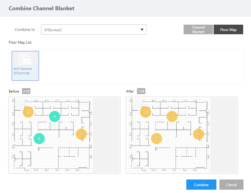 In addition, by selecting "Floor Map" from the "Combine Channel Blankets" dialog's upper right display format button, you can see a color-coded image of the channel blankets to which the APs belong after the combination.