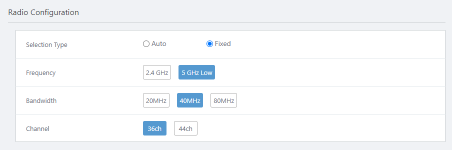 - Select "Frequency" from "2.4 GHz" (Radio 1) and "5 GHz Low" (Radio 2 W52).