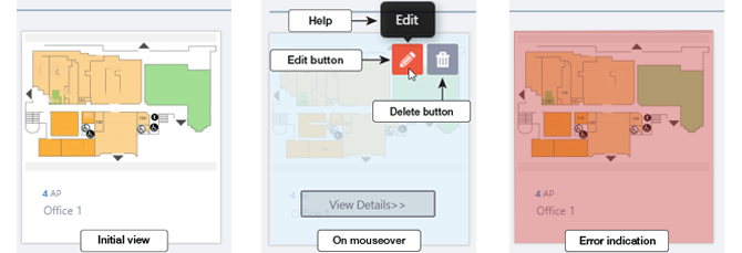 | Floor Map Panels | Each floor map is shown as a panel. The name of the floor map and the number of APs placed on the map are shown below the panel. When an Admin user hovers over a panel, that panel will become half-opaque, and "Edit" (pencil) and "Delete" (trashbin) buttons will appear at the top right of the panel Clicking the panel opens the "Floor Map Details" page for the floor map.