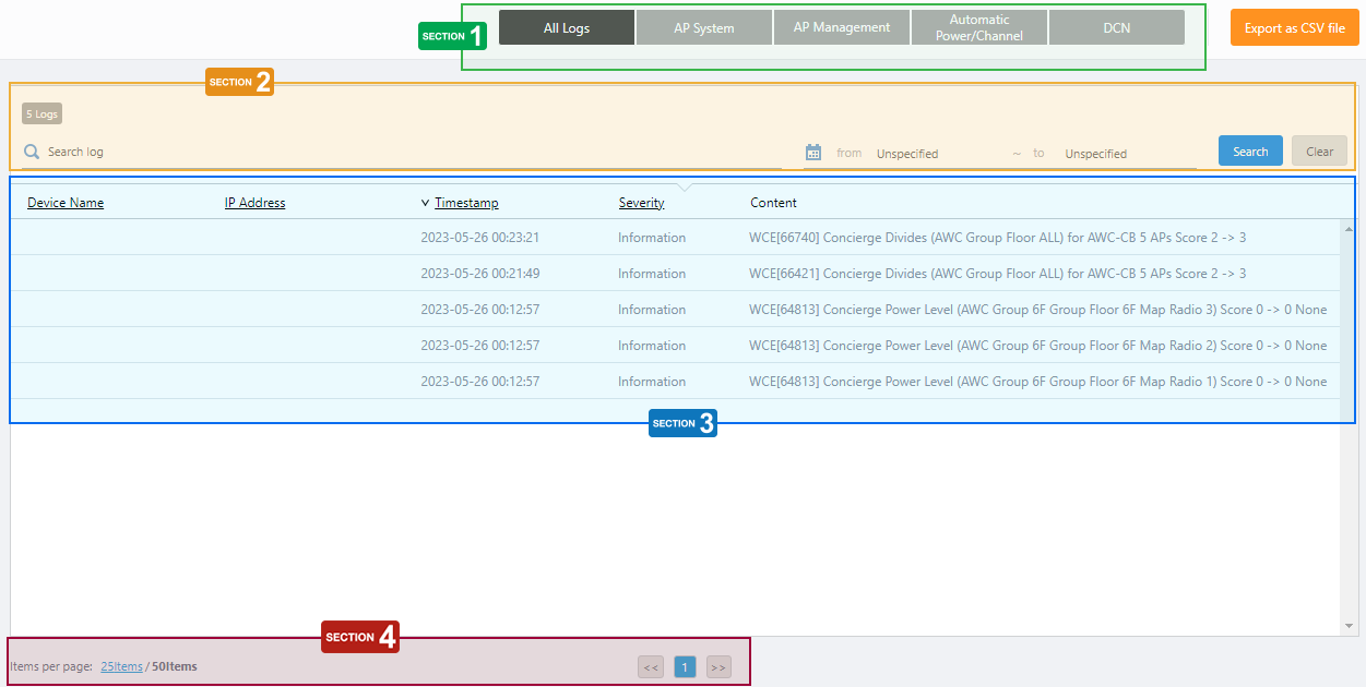| "Automatic Power/Channel" button | Shows only automatic channel/power adjustment logs.NoteThe device name and IP address columns are empty for the logs to do with automatic channel/power adjustment because those logs are recorded per Management Group. NoteOnly Admins can view logs on automatic channel/power adjustment. |