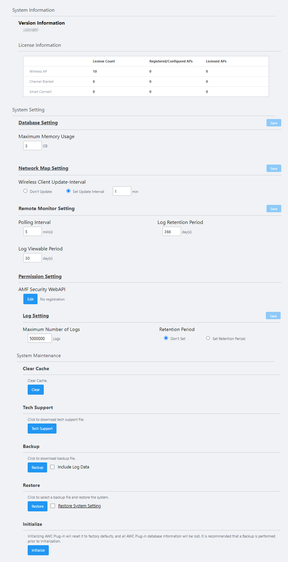 The System Setting page lets you see the AWC Plug-in version, factory-reset the plug-in, and configure system settings.