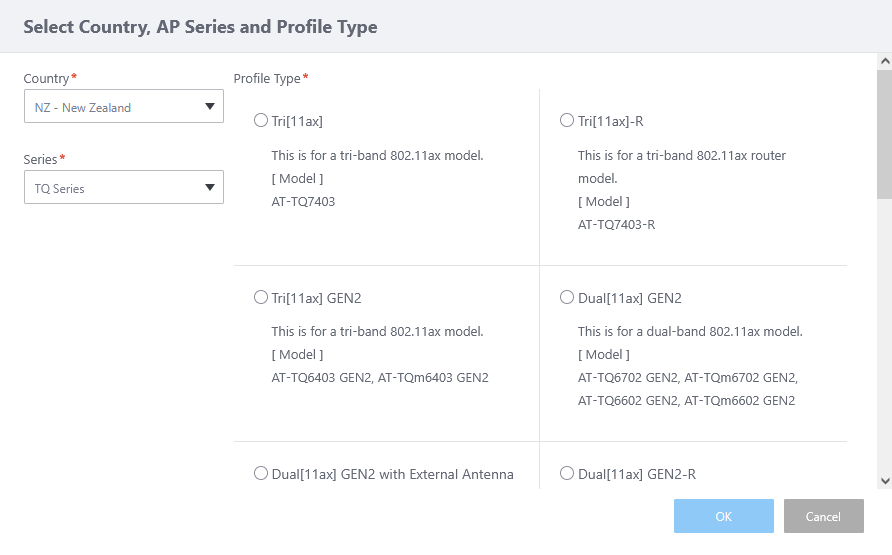 The "Select Country, AP Series and Profile Type" dialog box will appear.