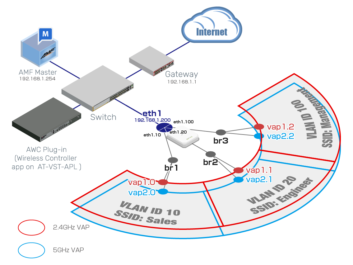 Each VAP communicates with the wired network side via a bridge interface. In this case, an 802.1Q Ethernet subinterface is created on eth1 interface in order to send and receive communications from the VAPs as packets with different VLAN tags.