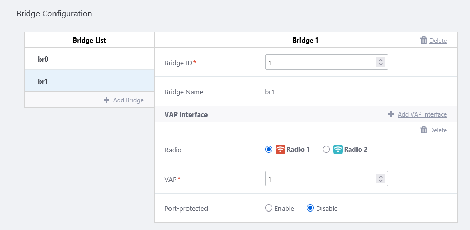 | Add VAP INterface | Add the VAP interface to be assigned to the bridge. Up to 10 VAP interfaces can be added per bridge. |