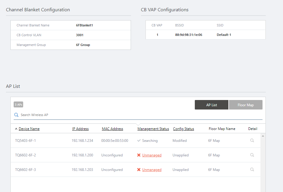 Checkbox Lets you select channel blankets. A checkbox in the header row can be used to check or uncheck all channel blankets. Unchecking the box in the heading row deselects all entries in the list. CB Name Shows the name of the channel blanket. CB Profile Name Shows the CB Profile name on which the channel blanket is based. Management Group Shows the list of Management Groups for the CB Profile. Assigned APs Shows the number of APs of which the CB Profile is assigned to. Unapplied APs Shows the number of APs for which pending configuration (AP Profile, CB Profile, SC Profile, or AP-specific configuration) exists. Detail (magnifying glass icon) Shows the "CB Profile Details" page. Refer to the Operation Reference > Channel Blanket > Create Channel Blanket" > "View Channel Blanket Information section for more details on the "CB Profile Details" page. - Select the CB Profiles to whose member APs you want to apply the pending configuration.