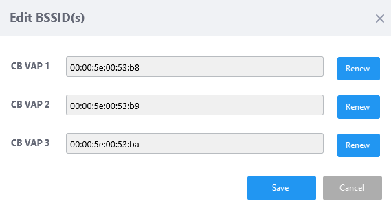 Most of the time it is not necessary to change this setting.Table 10: "Edit BSSID(s)" dialog box Item Name Description BSSID Indicates the BSSID for the VAP. "Renew" button Reselects the BSSID for the CB VAP.