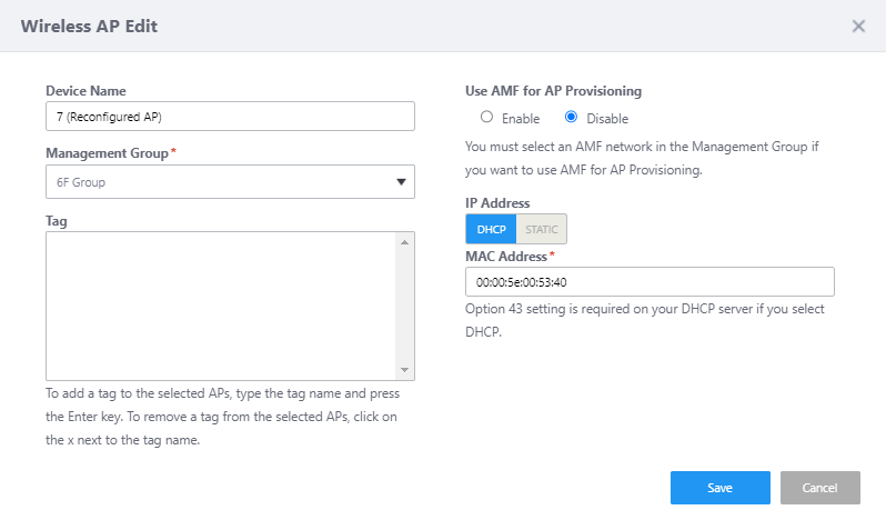 - Click "Save" at the top right of the Wireless AP Individual Configuration screen.