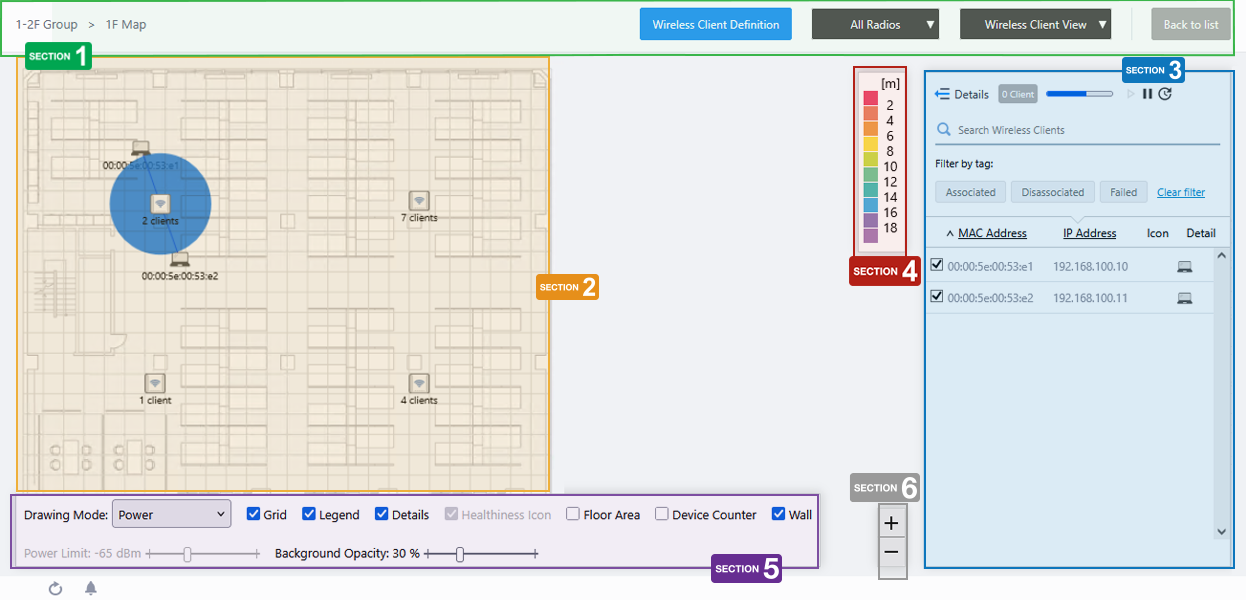 For more information on the heatmap view format for each drawing mode, see "Floor map details [radio status view]".