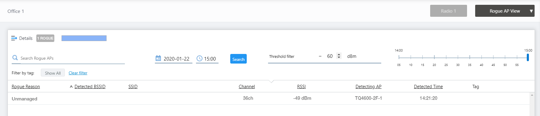 | RSSI | Received Signal Strength of the rogue AP observed on the detecting managed AP. A higher value (closer to 0) means a stronger signal, therefore the rogue AP may be closer to the detecting managed AP. |
