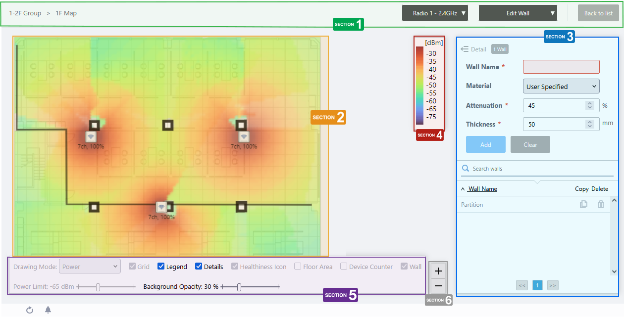 You can draw walls with polylines to simulate radio attenuation by walls, partitions, and pillars on the floor map.