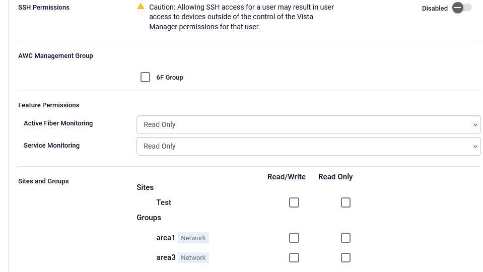 Permission controls on Vista Manager EX do not apply to operations on the SSH. In other words, if the SSH Permission is On, the user of the account can still make separate configuration changes in the CLI via the SSH connection to all AMF devices on the AMF network.