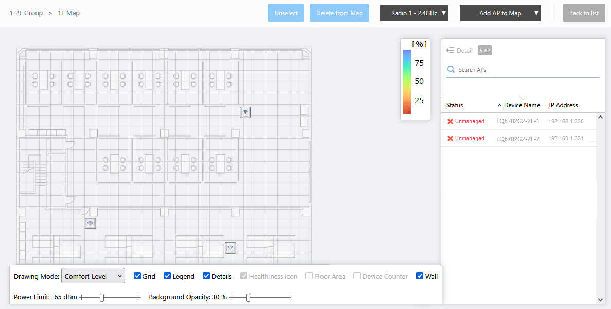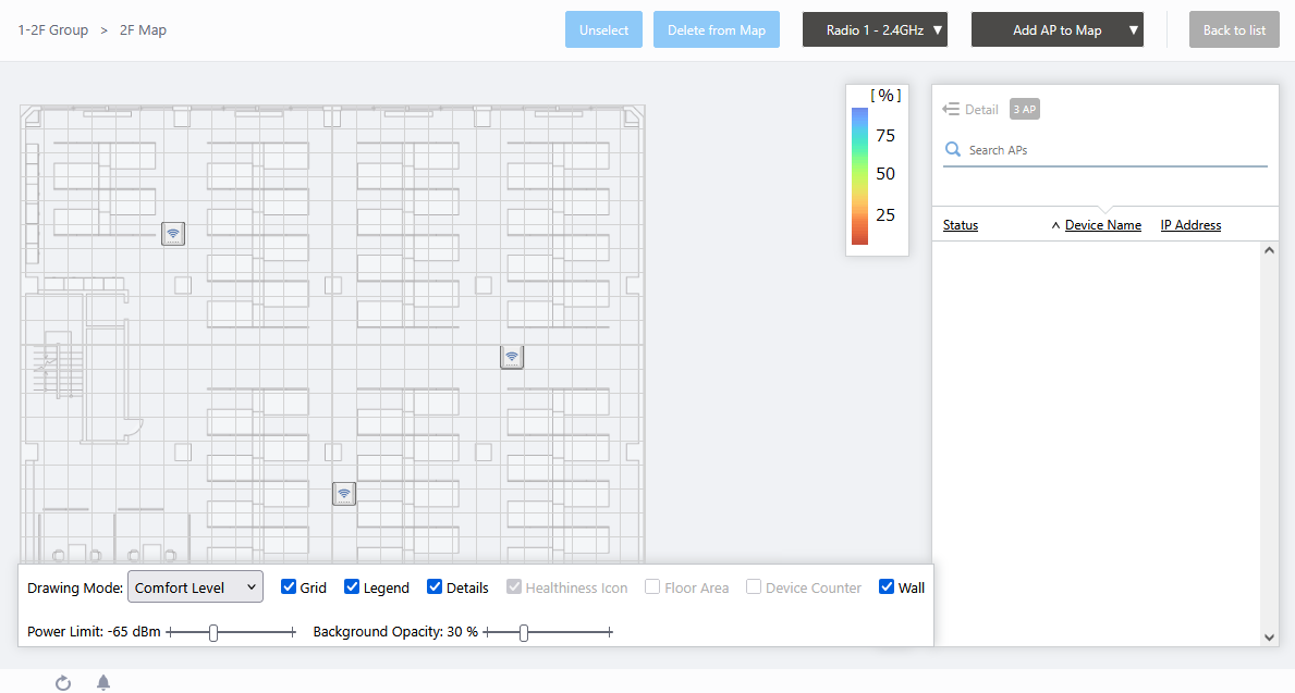 Select "Wireless Monitoring" > "Floor Map" from the AWC Plug-in menu, to display the "Floor Map" screen. You can see that the floor map "1F Map" has three APs placed on it.