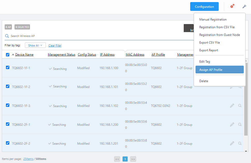 - On the AP list screen, you can see that the target APs' "Management Status" and "Configuration Status" were changed to "Searching" and "Modified" respectively.