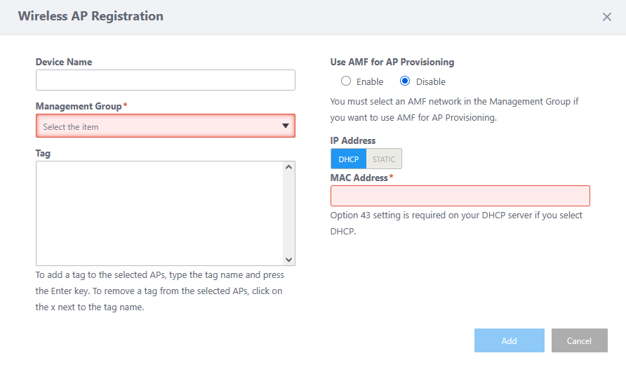- If "Use AMF for AP Provisioning" is disabled, the AWC Plug-in requires the AP's IP and MAC addresses for management.
