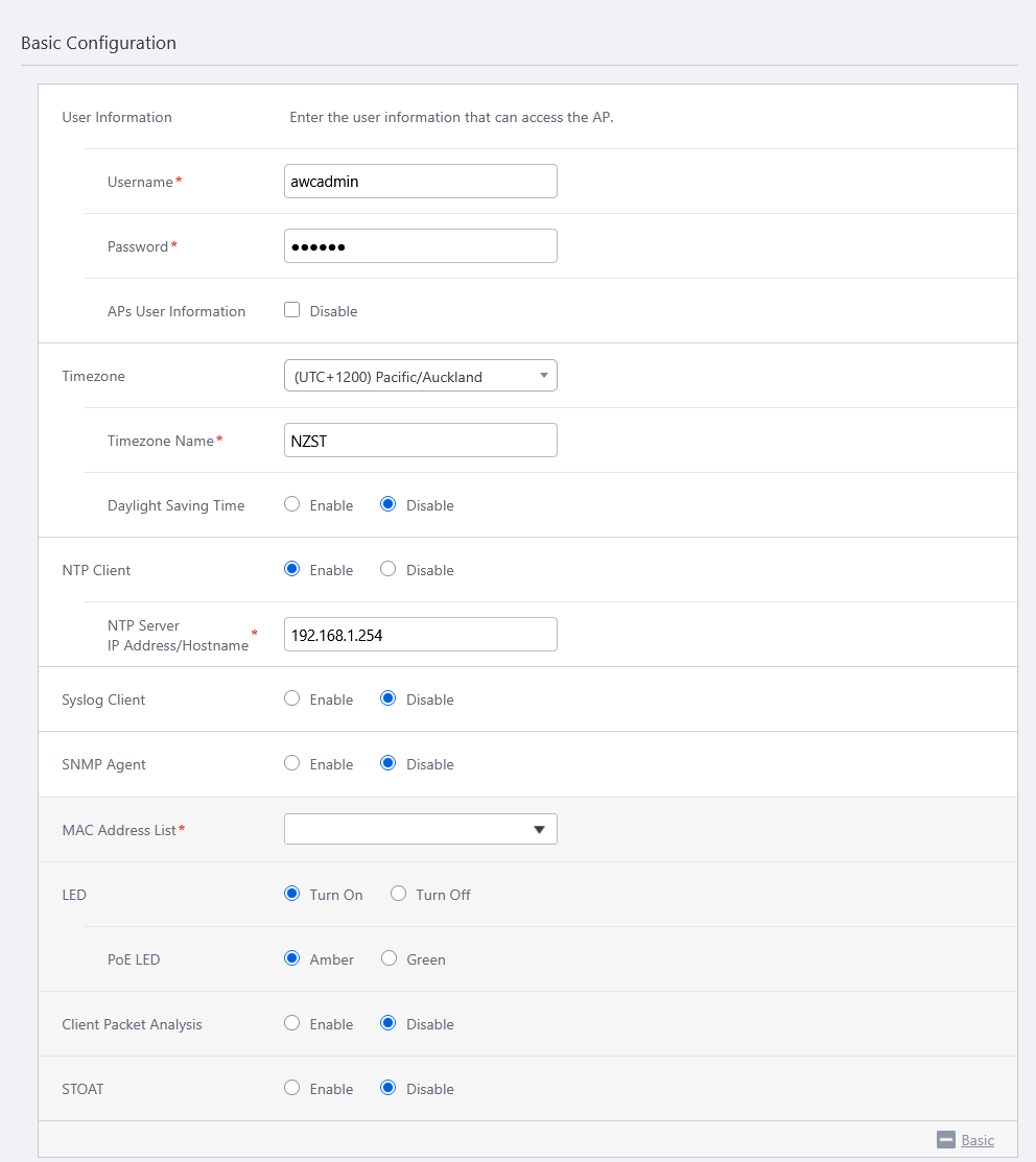 - You can specify the AP's system settings in the "Basic Configuration" section.