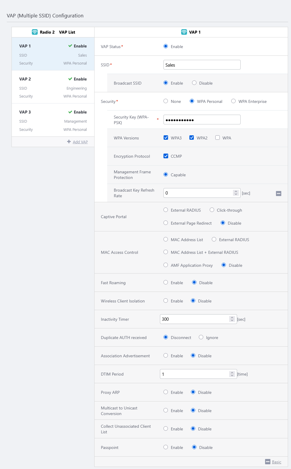 Table 3: AT-TQ6702 GEN2-R VAP (Multiple SSID) Configuration Radio 2 Item Name Value Description Radio 2 VAP 1 Radio 2 VAP 2 Radio 2 VAP 3 VAP Status Enable Enable Enable Specify one of "Enable", "Disable" and "Emergency". The VAP Status of VAP1 is always "Enable" when "Use Condition" in the "Radio Configuration" section is set to "Always". SSID Sales Engineer Management Specify an SSID (network name) to use on the VAP. Broadcast SSID Enable Enable Enable Specify whether to broadcast the SSID on the VAP. Security WPA Personal WPA Personal WPA Personal Specify a security method for the VAP. Security Key (WPA-PSK) Passphrase1 Passphrase2 Passphrase3 Specify an encryption key for the VAP. WPA Versions WPA3 / WPA2 WPA3 / WPA2 WPA3 / WPA2 Specify a WPA version to use on the VAP. Encryption Protocol CCMP CCMP CCMP Specify an encryption protocol to use on the VAP. Management Frame Protection (MFP) Capable Capable Capable Specify whether to protect Management Frames. Broadcast Key Refresh Rate 0 0 0 Specify an interval at which to refresh the broadcast key that is sent to clients on the VAP. Specifying "0" stops the key from refreshing. Captive Portal Disable Disable Disable Specify whether to use the Captive Portal feature on the VAP. MAC Access Control Disable Disable Disable Specify whether to use MAC Access Control on the VAP. Fast Roaming Disable Disable Disable Specify whether to use Fast Roaming of wireless clients. Inactivity Timer 300 300 300 Specify the delay before disconnecting a client that disappears without notifying the APs. Duplicate AUTH received Disconnect Disconnect Disconnect Select how to process connection requests from clients that have maintained a connection. Association Advertisement Disable Disable Disable Specify whether to use Association Advertisement. DTIM Period 1 1 1 Specify how frequently to insert a DTIM (Delivery Traffic Indication Map) in the AP's beacons (every 1 to 255 beacons). Proxy ARP Disable Disable Disable Specify whether to use Proxy ARP. Multicast to Unicast Conversion Disable Disable Disable Specify whether to convert multicast packets to unicast packets. Collect Unassociated Client List Disable Disable Disable Specifies whether or not to obtain a list of unregistered endpoints that have failed to authenticate to the RADIUS server in IES (Intelligent Edge Security). Passpoint Disable Disable Disable Specify whether to use Passpoint (Hotspot 2.0).