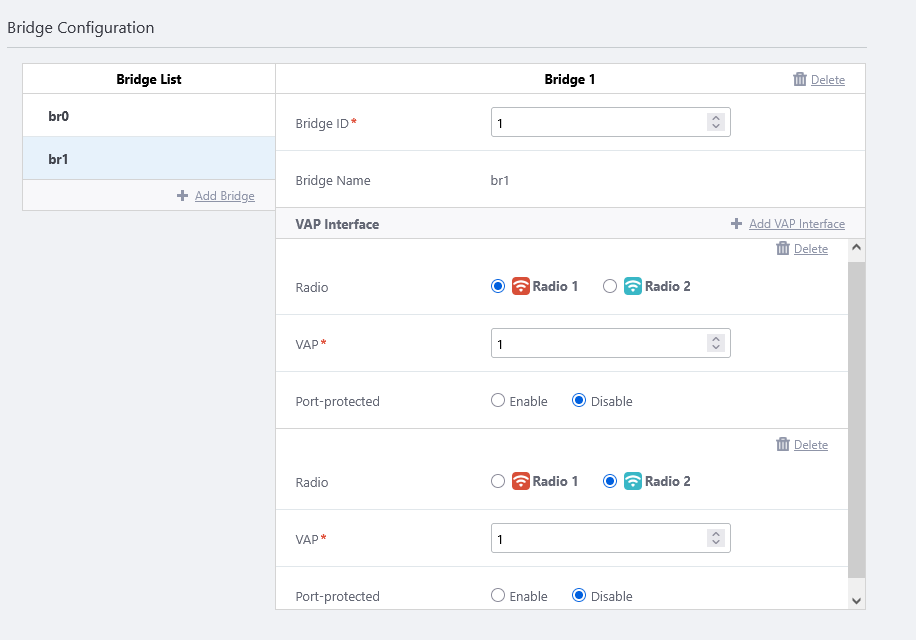 In the same way, assign VAP 2 for Radio 1 and 2 to bridge br2, and VAP 3 for Radio 1 and 2 to bridge br3.
