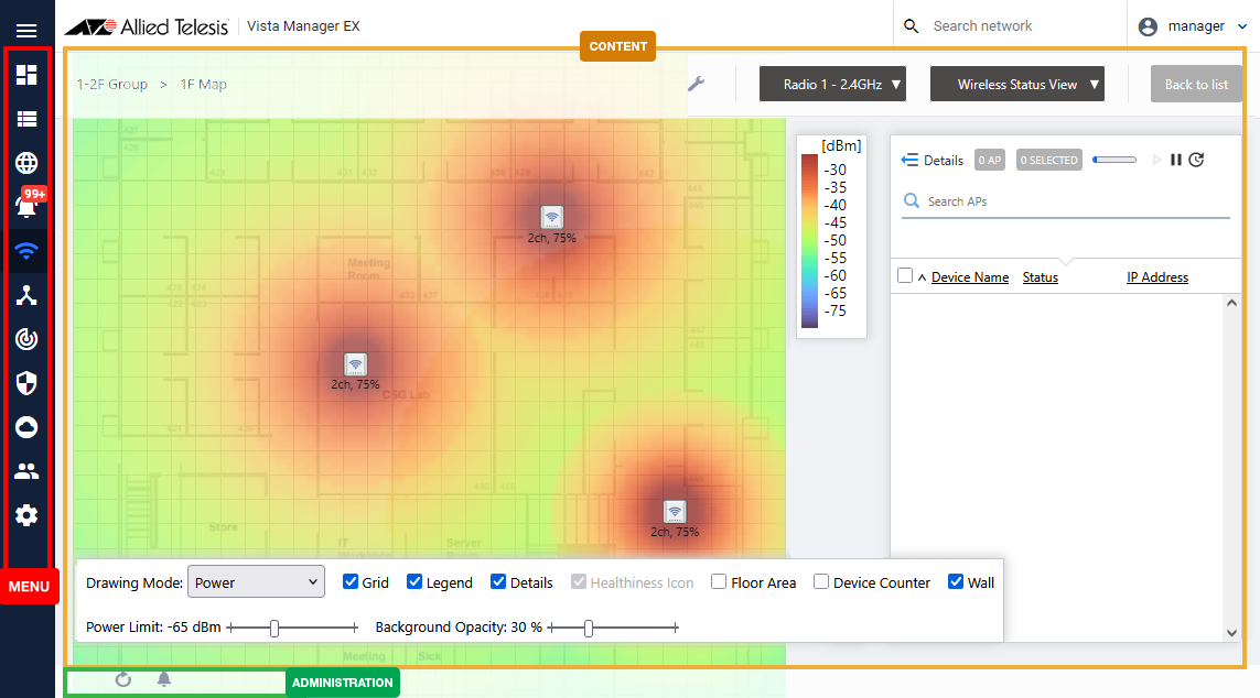 Menus in normal mode are the same as for Vista Manager EX. You can access the AWC Plug-in functions through the "AWC Plug-in" menu item on the Vista Manager EX main menu.When logged in as a User, "Wireless Monitoring", "Wireless Configuration" and "Device Search" menu items are available.
