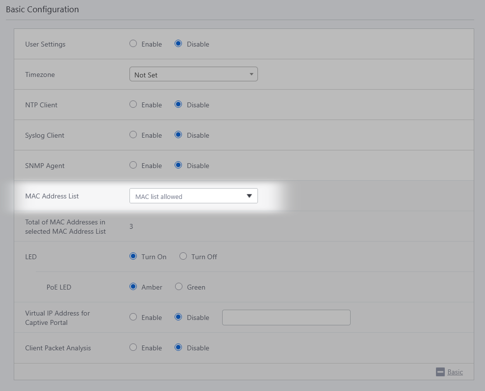 When you select "MAC Address List", the MAC Address List selected in the "Basic Configuration" section will be shown in the "Selected List" field.