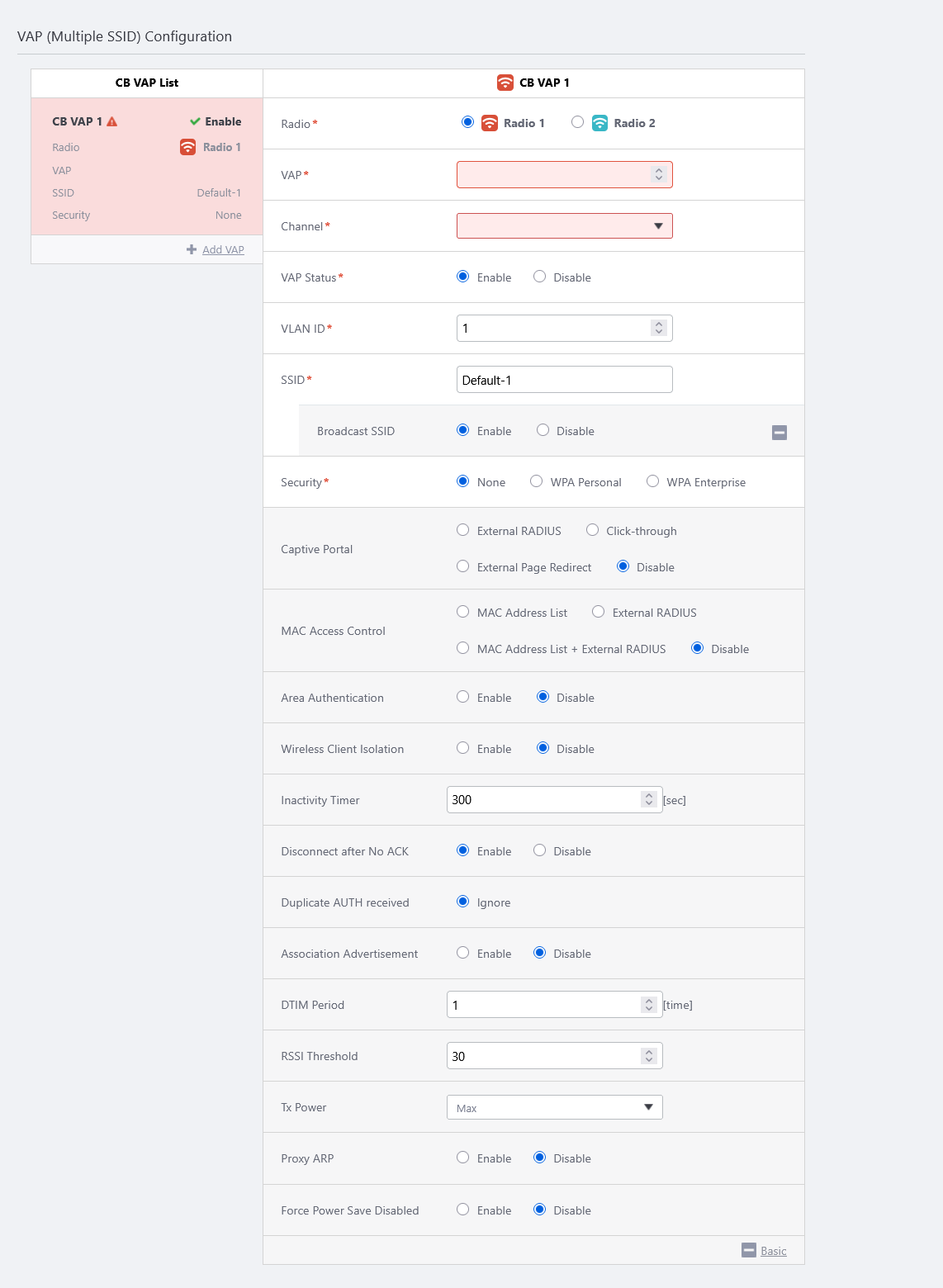 - Configure items in the Profile Configuration and VAP (Multiple SSID) Configuration sections as required.