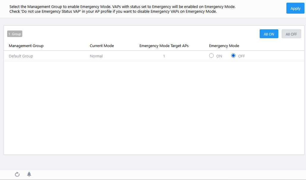 To disable Emergency Mode on APs in all Management Groups, click the "All OFF" button.