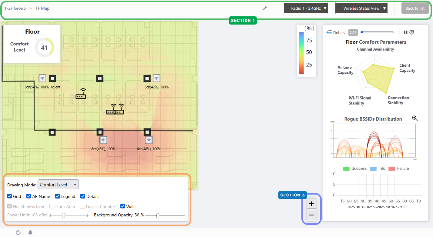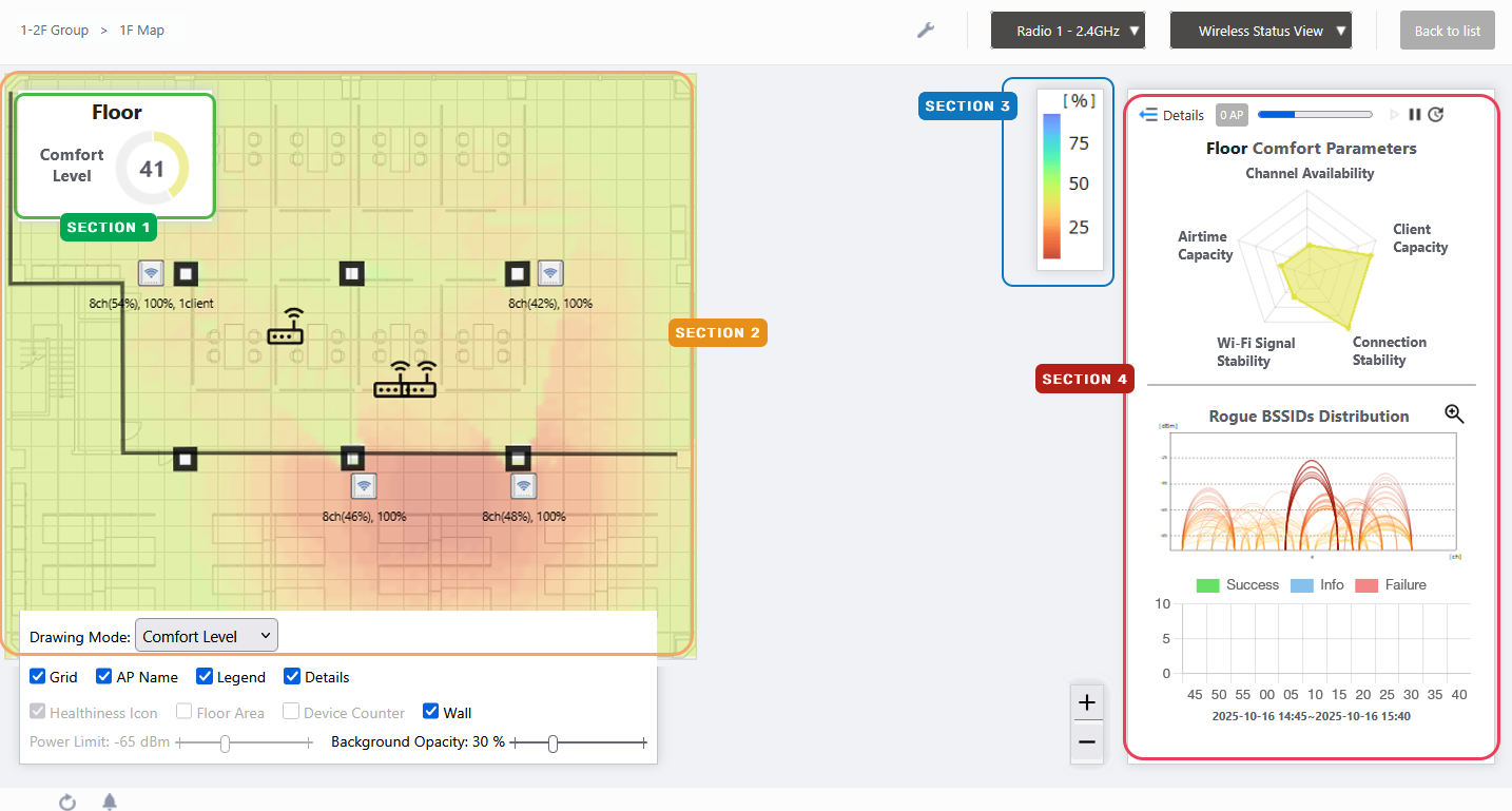 The floor is color-coded by comfort level, based on five comfort parameters: Channel Availability, Client Capacity, Connection Stability, Wi-Fi signal stability, and Airtime Capacity.