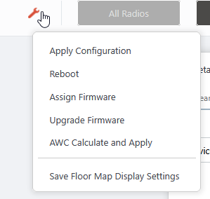 | "Spanner" icon | Hovering the mouse cursor over the Spanner icon shows a dropdown menu including some operations for managed APs. Select APs by checking on the AP list or clicking the AP icons on the floormap, you can then configure the selected APs. You cannot perform Apply Settings, Reboot, Assign Firmware, or Upgrade Firmware in Smart Connect view.![]()
