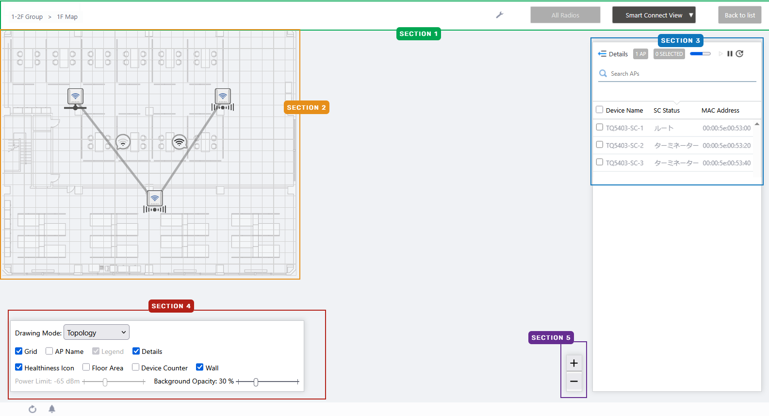 When an AWC-SC Smart Connect network is configured on the floor map, you can display the connection status, the AP roles, and so on.