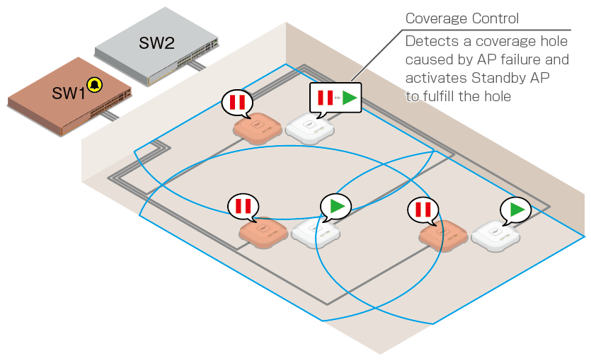 In the event of a coverage hole, AWC-SAC's Coverage Control will resume the radio output of the standby wireless AP to complement the coverage.