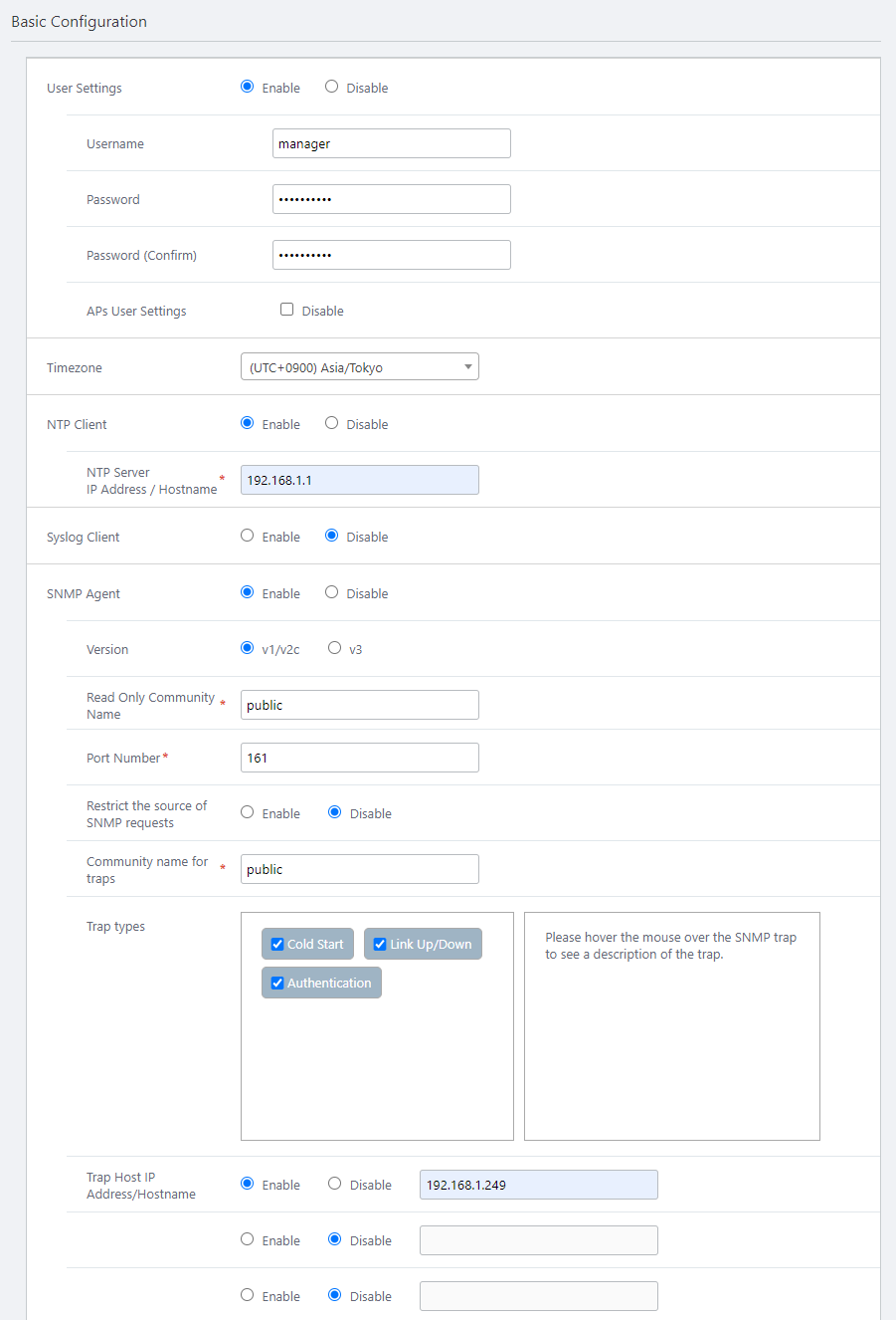 AuthenticationSelect the SNMP Trap types to generate. Trap Host IP Address/Hostname 192.168.1.249 Specify IP addresses or hostnames (FQDNs) to which SNMP traps will be sent.