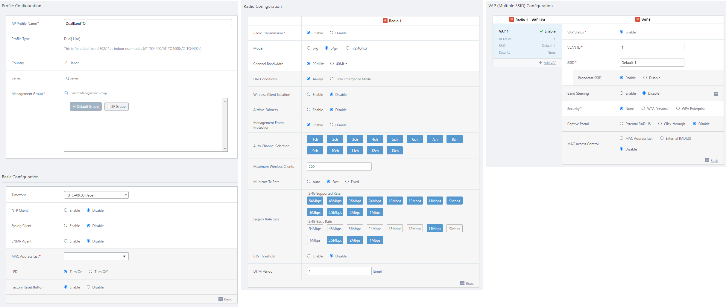 Configuration items of an AP Profile may vary depending on "Series" and "Profile Type". The following image shows a sample AP Profile for "TQ Series" / "Dual[11ac]".