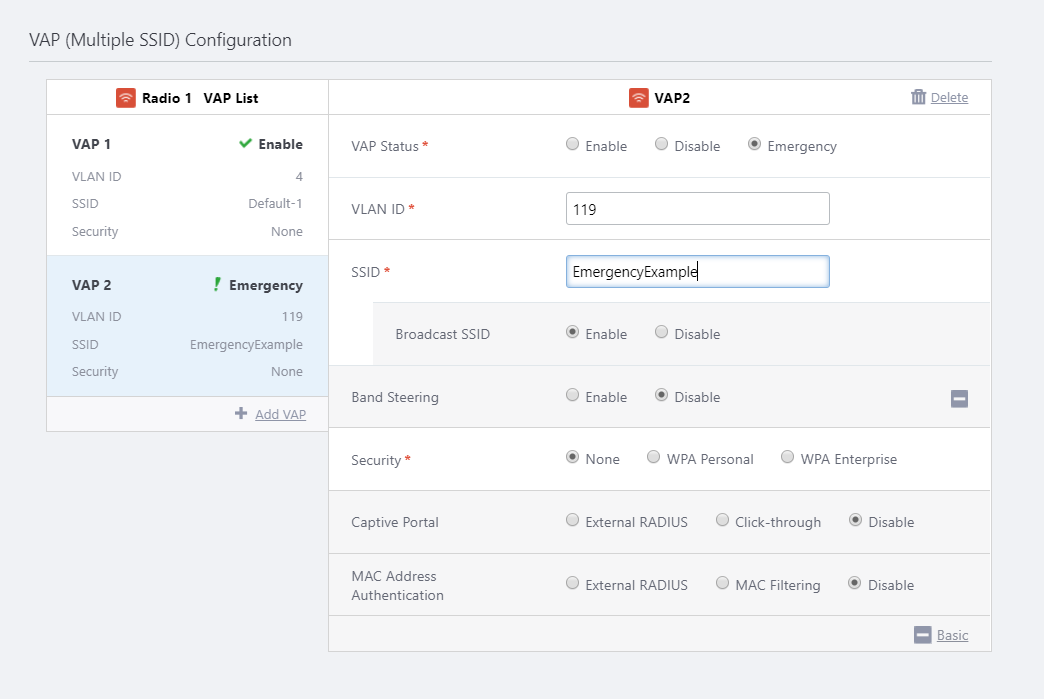 - Configure the newly created VAP as an emergency VAP.
