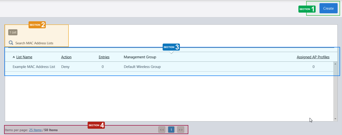 | "Create" button | Creates a new MAC Address List. Refer to Operation Reference > Wireless Configuration > Configure MAC Address Lists for more details. |