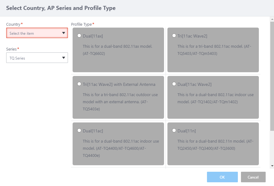 The "Select Country, AP Series and Profile Type" dialog box will appear.