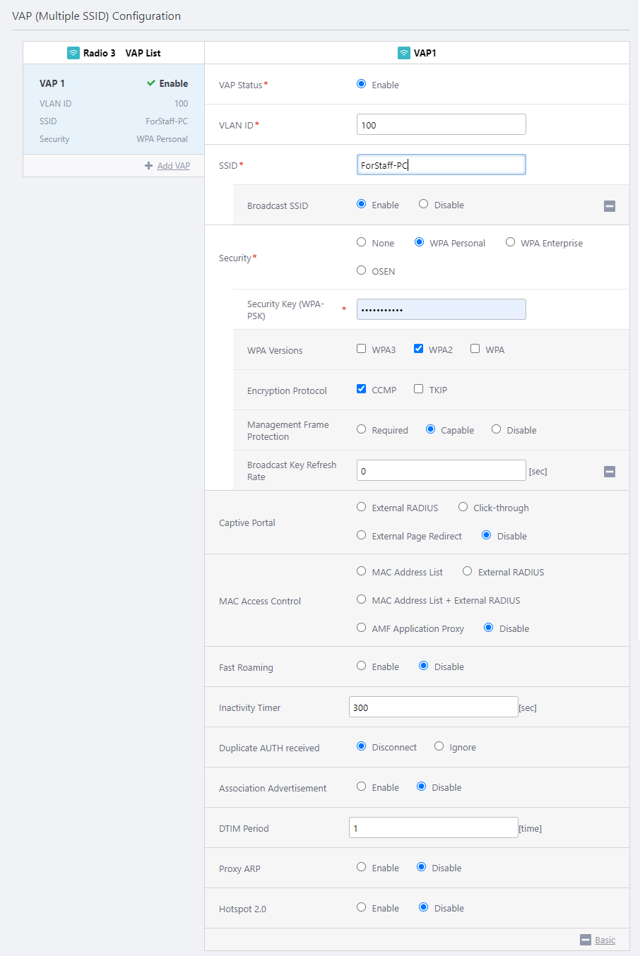 SSID ForStaff-PC Specify an SSID (network name) to use on the VAP. Broadcast SSID Enable Specify whether to broadcast the SSID on the VAP. Security WPA Personal Specify a security method for the VAP. Security Key (WPA-PSK) 5+@f/=0N1y Specify an encryption key for the VAP. WPA Versions WPA2 Specify a WPA version to use on the VAP. Encryption Protocol CCMP Specify an encryption protocol to use on the VAP. Management Frame Protection (MFP) Capable Specify whether to protect Management Frames. Broadcast Key Refresh Rate 0 Specify an interval at which to refresh the broadcast key that is sent to clients on the VAP. Specifying "0" stops the key from refreshing. Captive Portal Disable Specify whether to use the Captive Portal feature on the VAP. MAC Access Control Disable Specify whether to use MAC Access Control on the VAP. Fast Roaming Disable Specify whether to use Fast Roaming of wireless clients. Inactivity Timer 300 Specify the delay before disconnecting a client that disappears without notifying the APs. Duplicate AUTH received Disconnect Select how to process connection requests from clients that have maintained a connection. Association Advertisement Enable Specify whether to use Association Advertisement. DTIM Period 1 Specify how frequently to insert a DTIM (Delivery Traffic Indication Map) in the AP's beacons (every 1 to 255 beacons). Proxy ARP