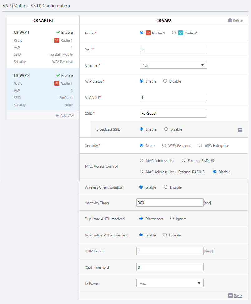 - Next, click "+ Add VAP" on "VAP (Multiple SSID) Configuration" to create another CB VAP for guests.