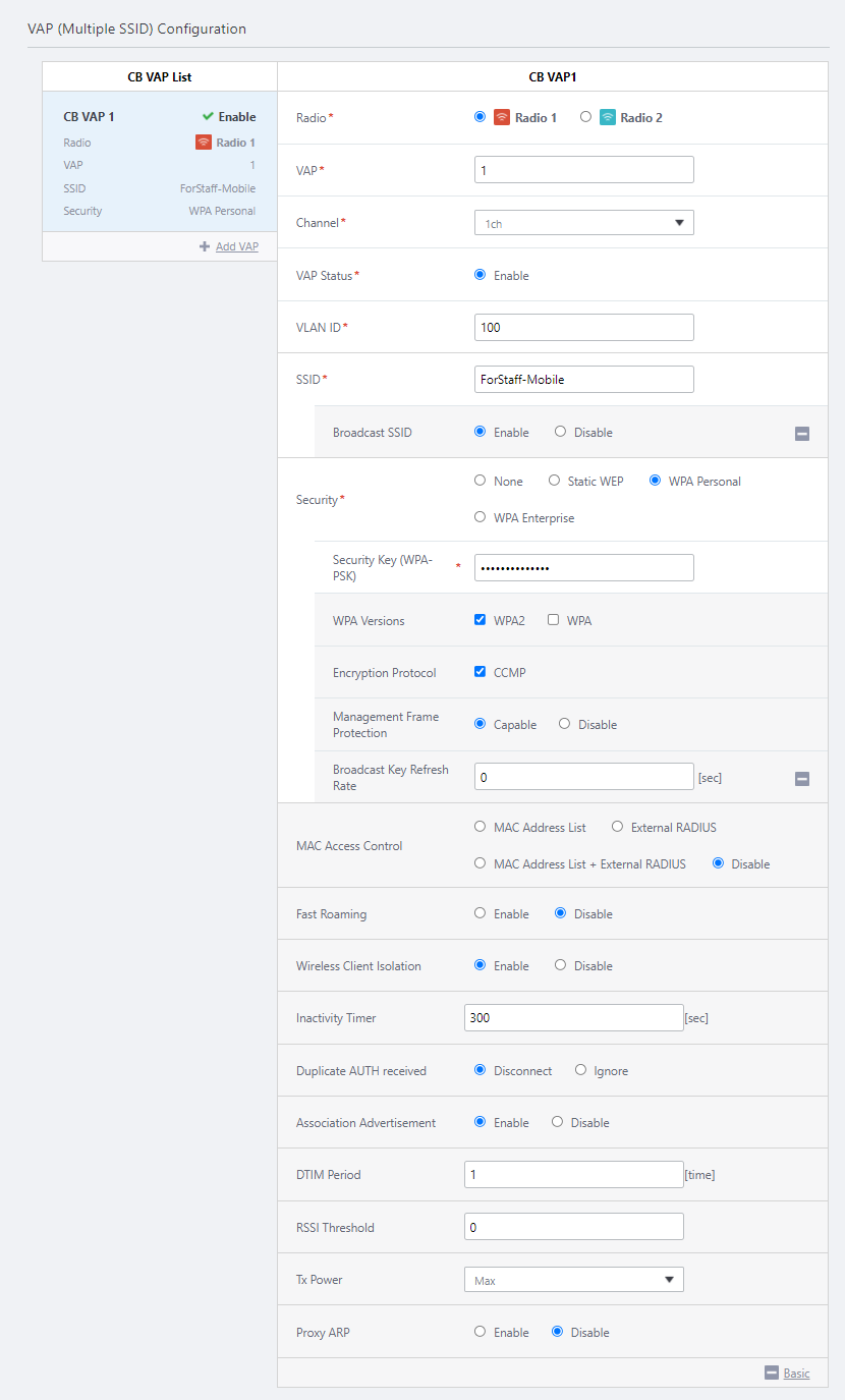 SSID ForStaff-Mobile Specify an SSID (network name) to use on the CB VAP. Broadcast SSID Enable Specify whether to broadcast the SSID on the CB VAP. Security WPA Personal Specify a security method for the VAP. Security Key (WPA-PSK) 5+@f/=0N1y Specify an encryption key for the VAP. WPA Versions WPA2 Specify a WPA version to use on the VAP. Encryption Protocol CCMP Specify an encryption protocol to use on the VAP. Management Frame Protection (MFP) Capable Specify whether to protect Management Frames. Broadcast Key Refresh Rate 0 Specify an interval at which to refresh the broadcast key that is sent to clients on the VAP. Specifying "0" stops the key from refreshing. MAC Access Control Disable Specify whether to use MAC Access Control on the VAP. Fast Roaming Disable Specify whether to use Fast Roaming of wireless clients. Wireless Client Isolation